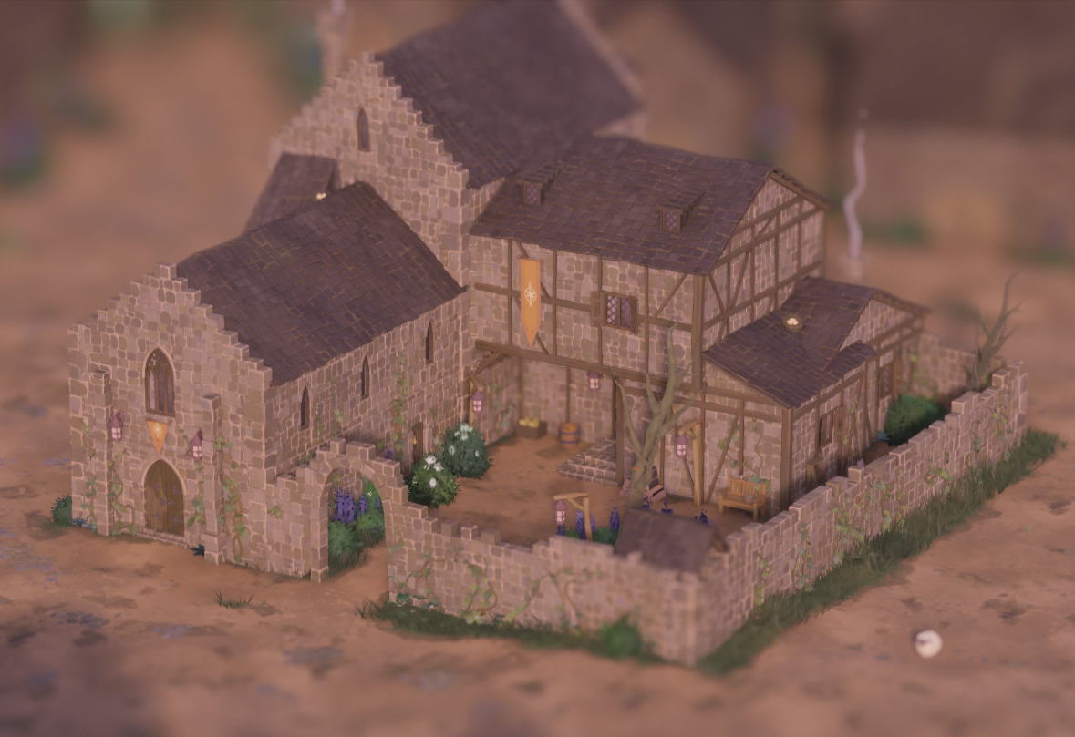 Z zewnątrz dom nie wyróżnia się przesadnym przepychem. Surowy kamień, ciemne dachówki i skromne proporce zwisające nad wejściem nadają mu raczej charakter surowego schronienia niż siedziby możnowładcy. Wśród brukowanych ścieżek wyrastają dzikie krzewy i pnącza, a w samym centrum dziedzińca rozciąga się poskręcane drzewo o nienaturalnie powykręcanych konarach. Wieczorami płoną tu pojedyncze lampiony, rzucając ciepłe, złotawe światło na kamienne mury. Cały kompleks otacza niski, kamienny mur wyznaczający granice posesji. W powietrzu często rozbrzmiewają odgłosy pił, młotów i dłut, świadczące o jego powolnej rozbudowie.