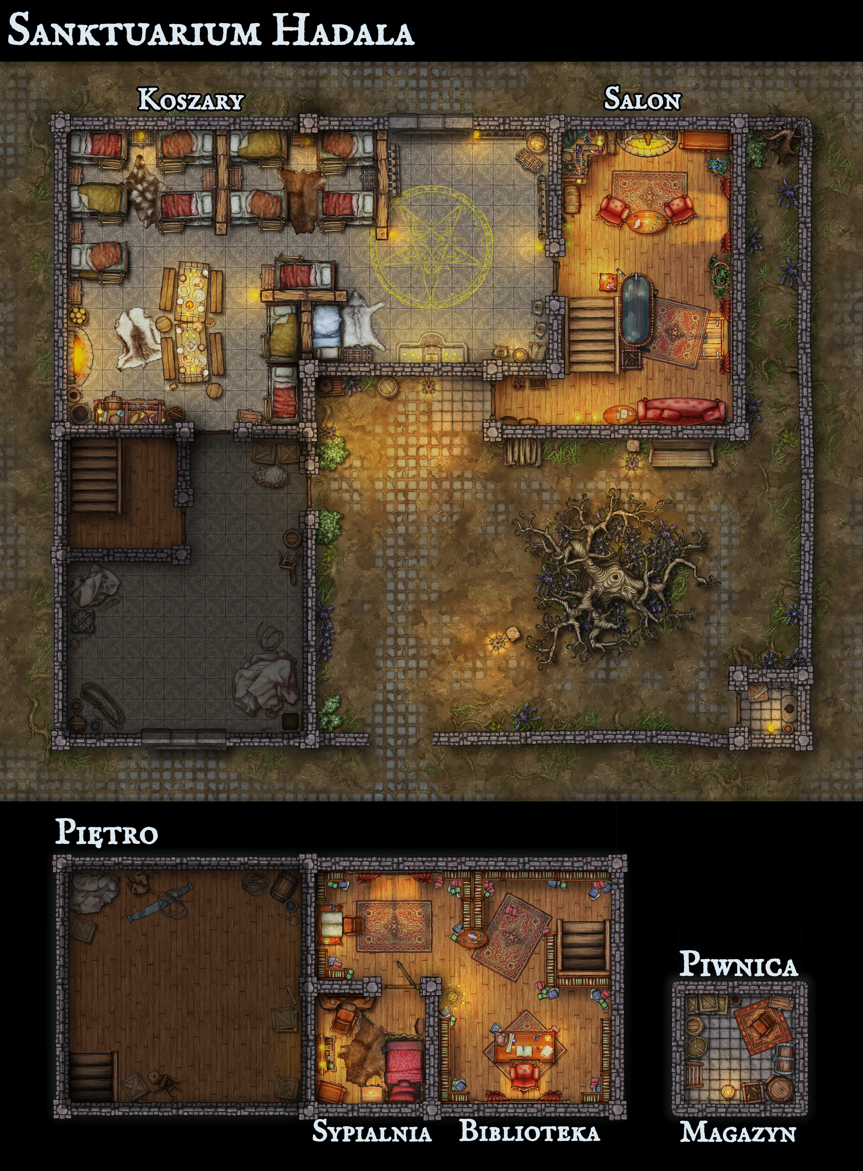 Na parterze mieści się przestronny salon, który pełni funkcję miejsca spotkań i narad. Miękkie dywany tłumią kroki, a kominek niemal zawsze tli się żarem. To właśnie tu, w której Vanir przyjmuje gości, wysłuchuje próśb i snuje wizje przyszłości. Wygodne fotele i niskie stoliki nadają pomieszczeniu przytulny, ciepły klimat. Dawne pomieszczenie gospodarcze na parterze, które początkowo pełniło rolę kaplicy przekształcono w rozległe koszary, stanowiące bazę wypadową dla Gwardii Hadala. To tutaj szkolą się wojownicy oddani Wybrańcowi, ćwicząc walkę i poświęcając się kontemplacji. Rzędy łóżek, stojaki na broń i prowizoryczne stoły do posiłków nadają temu miejscu surowy, wojskowy charakter. W ciągu dnia słychać tu szczęk stali i stukanie kufli, nocą zaś pomruki rozmów i sporadyczne wybuchy śmiechu.