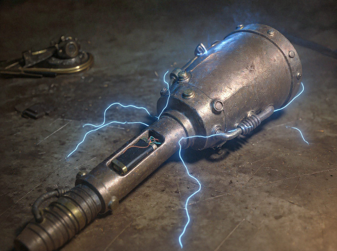 This is a crude mechanical device that resembles a scrap metal club. It buzzes with static electricity and has a battery slot in the handle.