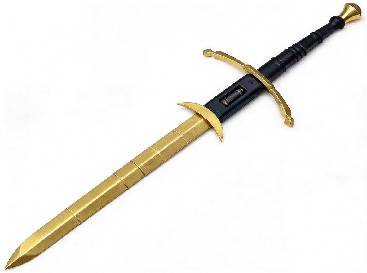 This is a sword with a battery slot in the handle and copper lines running across the blade. When pressed, the button adds electrical damage to the next hit.