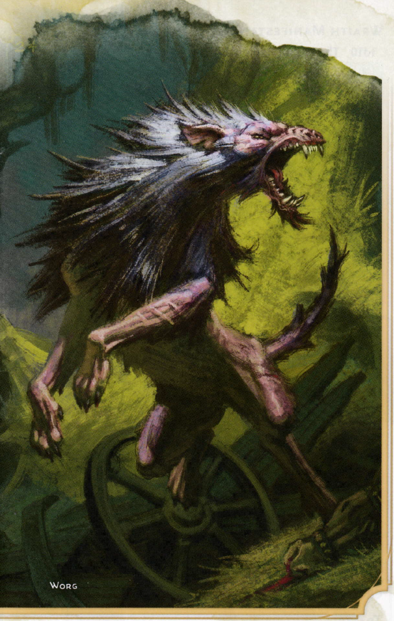 Multiattack. The Worg does a Bite and Claw attack. Bite. Melee Attack Roll. +5, reach 5 ft. Hit:7 ( 1d8+3 ) Piercing damage, and the next attack roll made against the target before the start of the worg's next turn has Advantage. Claw. Melee Attack Roll. +5, reach 5 ft. Hit:6 ( 1d6+3 ) Piercing damage.